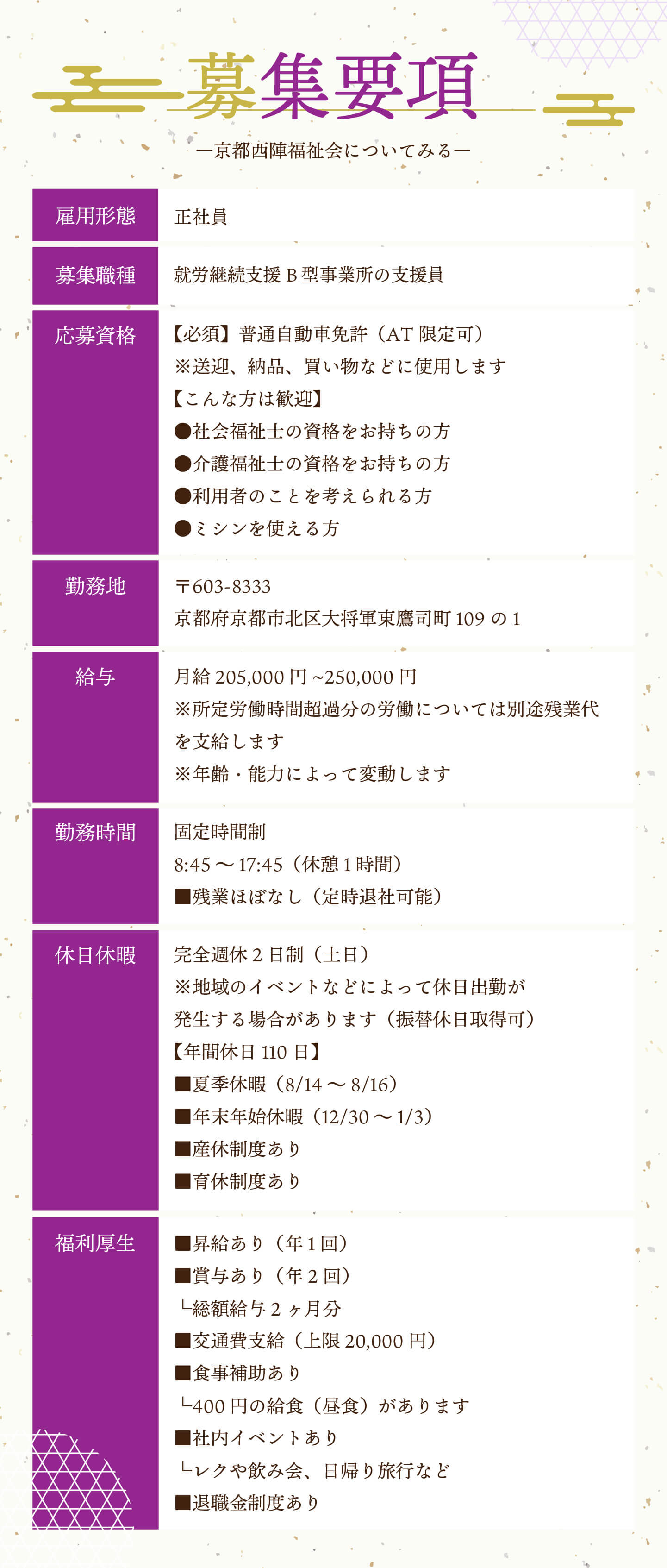 | 会社名 | 社会福祉法人京都西陣福祉会 |